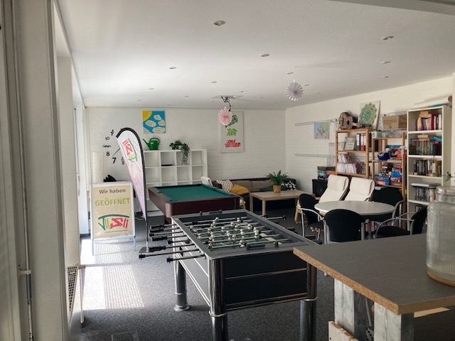 Im Eingangsbereich befindet sich ein großzügiger Aufenthaltsraum für Jugendliche mit einer selbstgebauten Theke.
